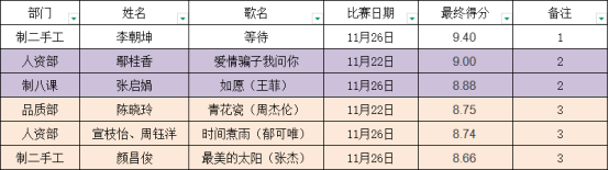 經(jīng)過(guò)兩場(chǎng)激烈的角逐,“永佳杯”歌唱比賽的最終排名終于揭曉!在萬(wàn)眾期待中,制二手工線(xiàn)李朝坤憑借其醇厚動(dòng)人的嗓音和出色的舞臺(tái)表現(xiàn)力摘得桂冠,由常務(wù)副總黃總為其頒發(fā)了獎(jiǎng)狀及獎(jiǎng)金;人資部鄢桂香、制八課張啟娟獲得亞軍,由模具部部長(zhǎng)馮文均為其頒發(fā)了獎(jiǎng)狀及獎(jiǎng)金;品質(zhì)部陳曉玲、人資部宣枝怡和周鈺洋、制二手工顏昌俊贏得了季軍的榮譽(yù),由財(cái)務(wù)部部部長(zhǎng)張金平為其頒發(fā)了獎(jiǎng)狀及獎(jiǎng)金。